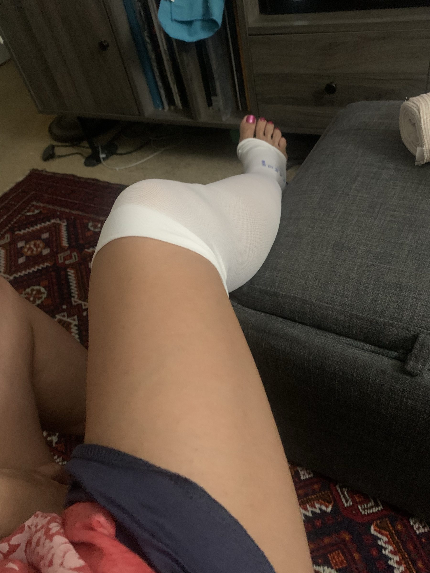 I’m doing gym stuff again, but making sure I take it easy and don’t push it too far. I can walk almost normal now! And the bruising is gorgeous, so nasty looking and utterly fascinating. I think the icing I’ve been doing, and then wearing this sexy sexy compression sock at night as I sit here watching TV, has really helped.
